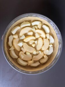 - Apfel (oder Birnen) Stücke auf dem Mürbteig verteilen.