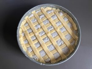 - Aus dem restlichen Mürbteig 3mm Dicke und ca 1 cm Breite Streifen erstellen. Kreuzförmig über den Kuchen geben.
