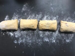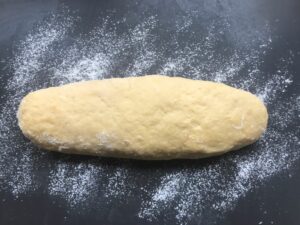 - Teig nochmal kurz verkneten, damit sich die Manden gut verteilen und zu einer ca. 50 cm langen Rollen formen.