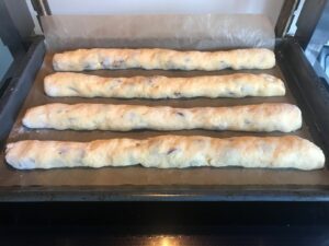 - Aus dem Backofen nehmen und die vorgebackenen Rollen in 1,5-2 cm breite, schräge Streifen schneiden.