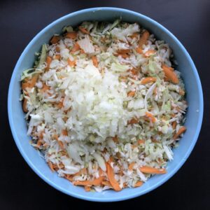 - Zwiebel in kleine Würfel schneiden und mit dem Weißkohl und Karotten in einer Schüssel vermischen.