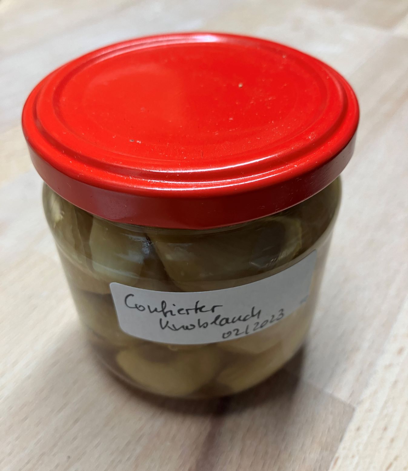 - Die Zehen in sterilisierte Gläser einfüllen (bis ca. 1cm vom oberen Rand) und fest andrücken. So viel Öl angießen bis die Knoblauchzehen gerade bedeckt sind.