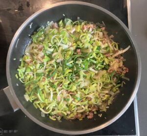- Speck in einer Pfanne anbratennach 2-3 Minuten die Zwiebeln dazugeben und ggf. etwas Öl/Butterschmalz hinzufügen. Weitere 2-3 Minuten weiter braten, bis die Zwiebeln glasig sind. Dann den Lauch dazugeben und weiter anbraten bis der Lauch weich aber nicht zerkocht ist.Mit Salz und Pfeffer abschmecken.