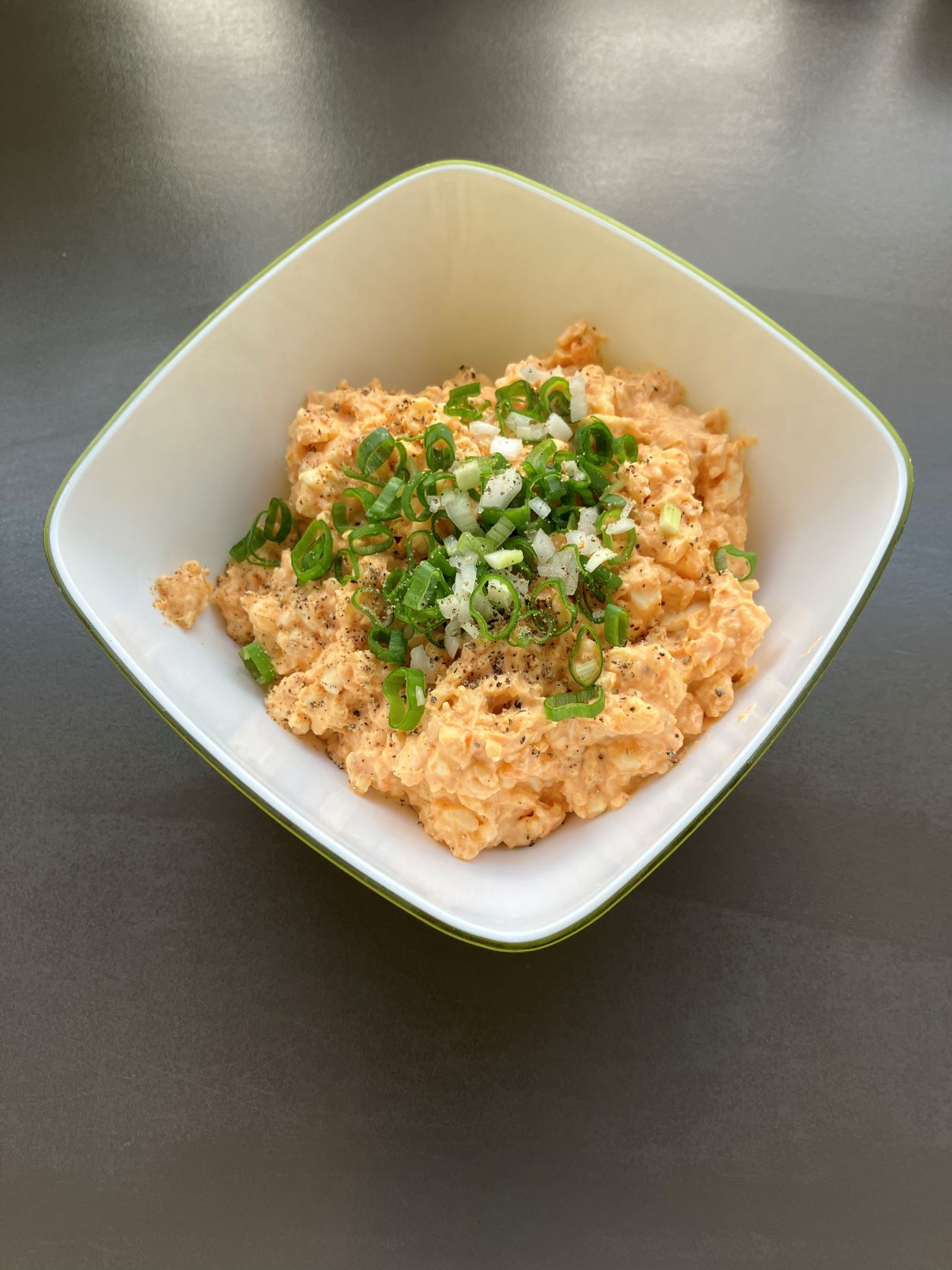 • Zwiebeln klein schneiden und mit den Gewürzen unter die Masse mischen.