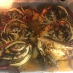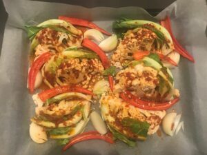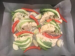 • Blumenkohl teile auf ein mit Pergament belegtes Bleck verteilen. Zwiebelstücke und Chilischoten dazwischen verteilen.