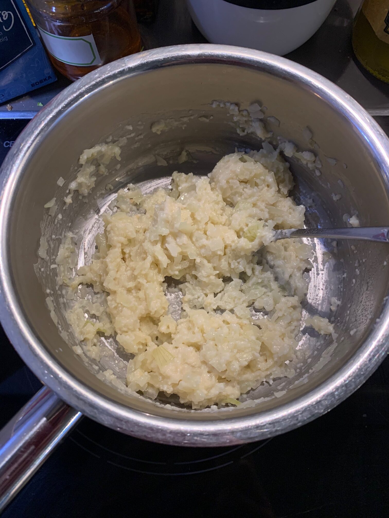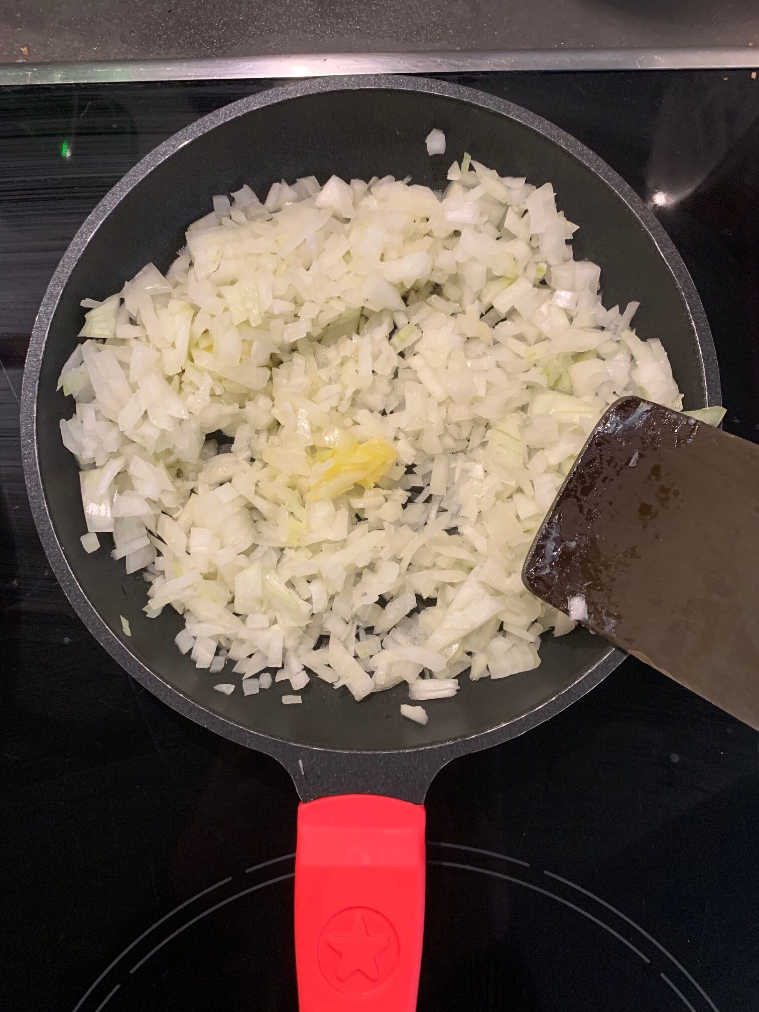• Zwiebeln möglichst fein würfeln und glasig anschwitzen