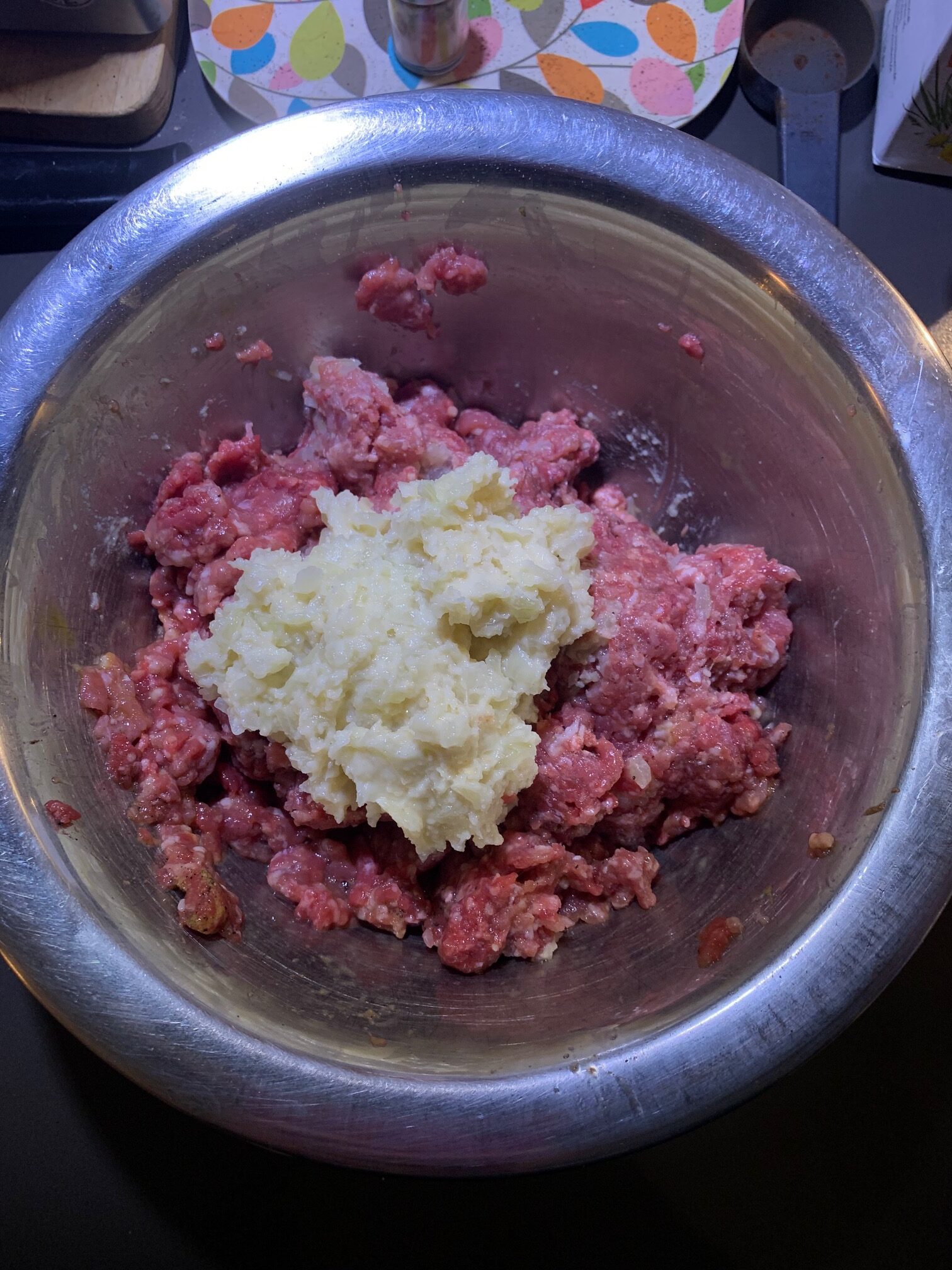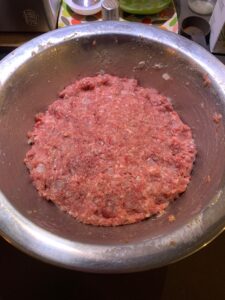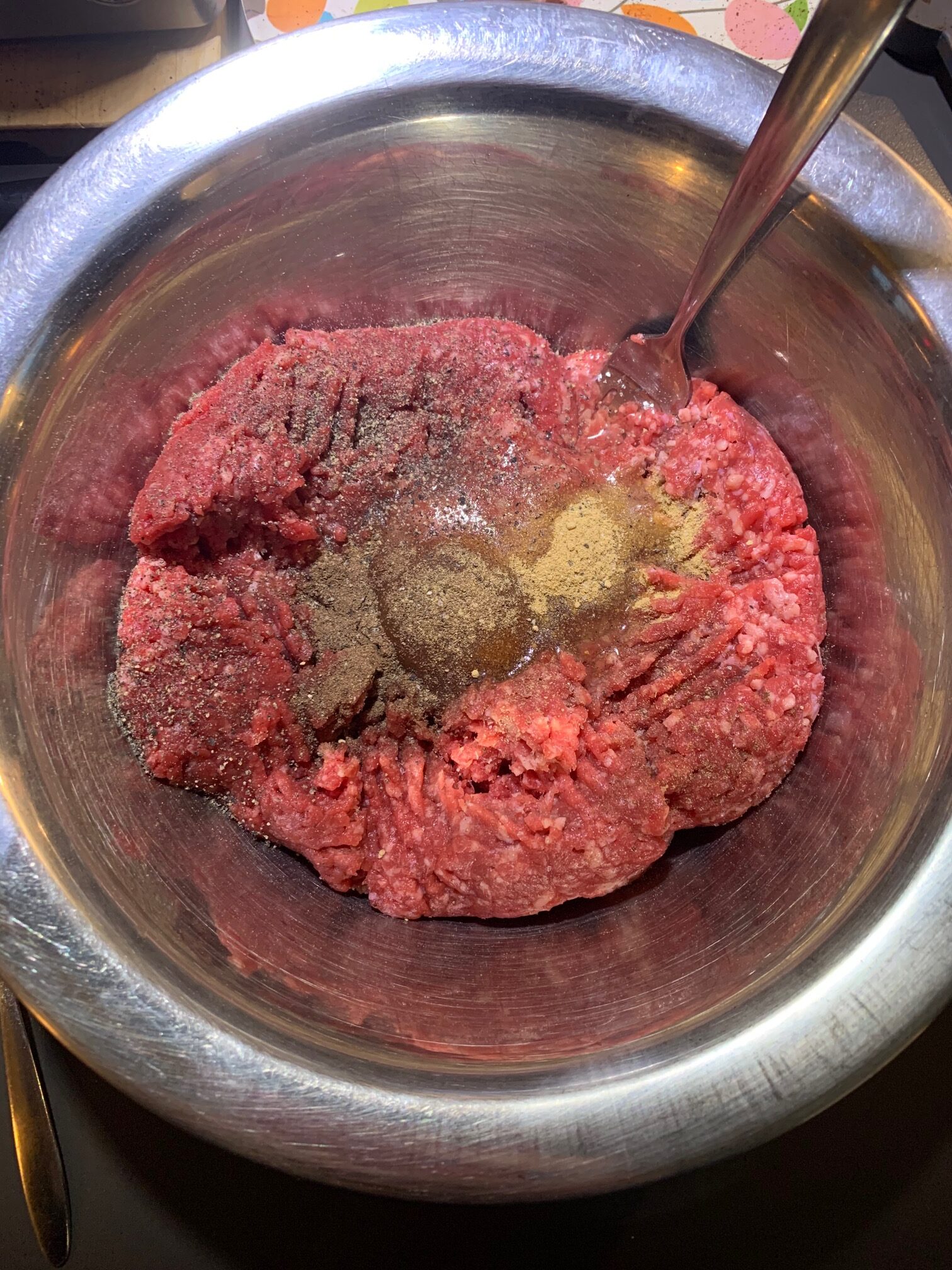 • Jetzt Fleisch mit Zwiebelmischung, Ei, Piment, Ingwerpulver, Salz und Pfeffer per Hand gut durchkneten bis alles zu einer einheitlichen Masse wird