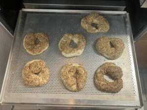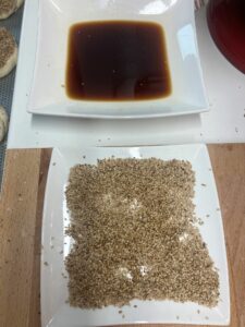 - Die Teigringe mit einer Seite zuerst in die Wasser-Pekzez-Mischung tauchen und dann in den Sesamteller legen damit die Oberseite gut mit Sesam belegt ist.