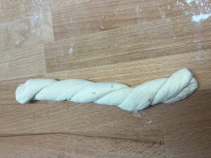 - Teiglinge auf der Arbeitsfläche ohne Mehl zu ca. 50 cm langen Strängen rollen, in der Mitte umfalten und die beiden Stränge verkordeln.Zu einem Ring formen und die Enden zusammendrücken.