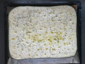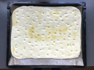 - In den Teig mit den Fingerkuppen kleine Dellen machen und mit Olivenöl bepinseln.