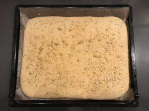 - Teig nochmal 30 Minuten gehen lassen. Anschließend nochmals mit Olivenöl besreichen und mit dem groben Meersalz und dem klein gehackten Rosmarin bestreuen.