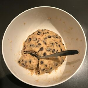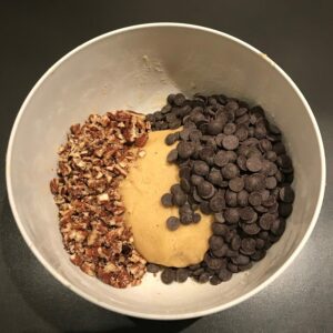 - Schokopellets und Pekanüsse grob zerkleinern und mit dem Teig verkneten.