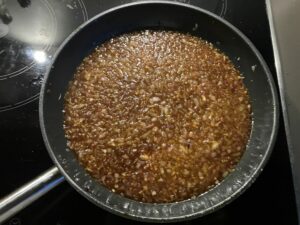 - Chillisauce, Pfeffer und geräuchertes Paprikapulver hinzugeben und gut verrühren. Ahornsirup und Whisky hinzugeben, die Hitze auf ein Maximun erhöhen und noch 3 Minuten kochen lassen um die Flüssigkeit zu reduzieren…. bis eine Art Zwiebelsirup entstanden ist.