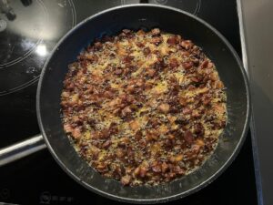 - Die Baconscheiben in kleine Streifen oder Quadrate schneiden und in einer Pfanne, bei mittlerer Hitze auf dem Herd auslassen. Die Pfanne nicht zu heiß werden lassen. Speck soll durch ständiges Rühren ausgelassen und knusprig werden, ohne zu verbrennen. Der Vorgang dauert ca. 40-45 Minuten.