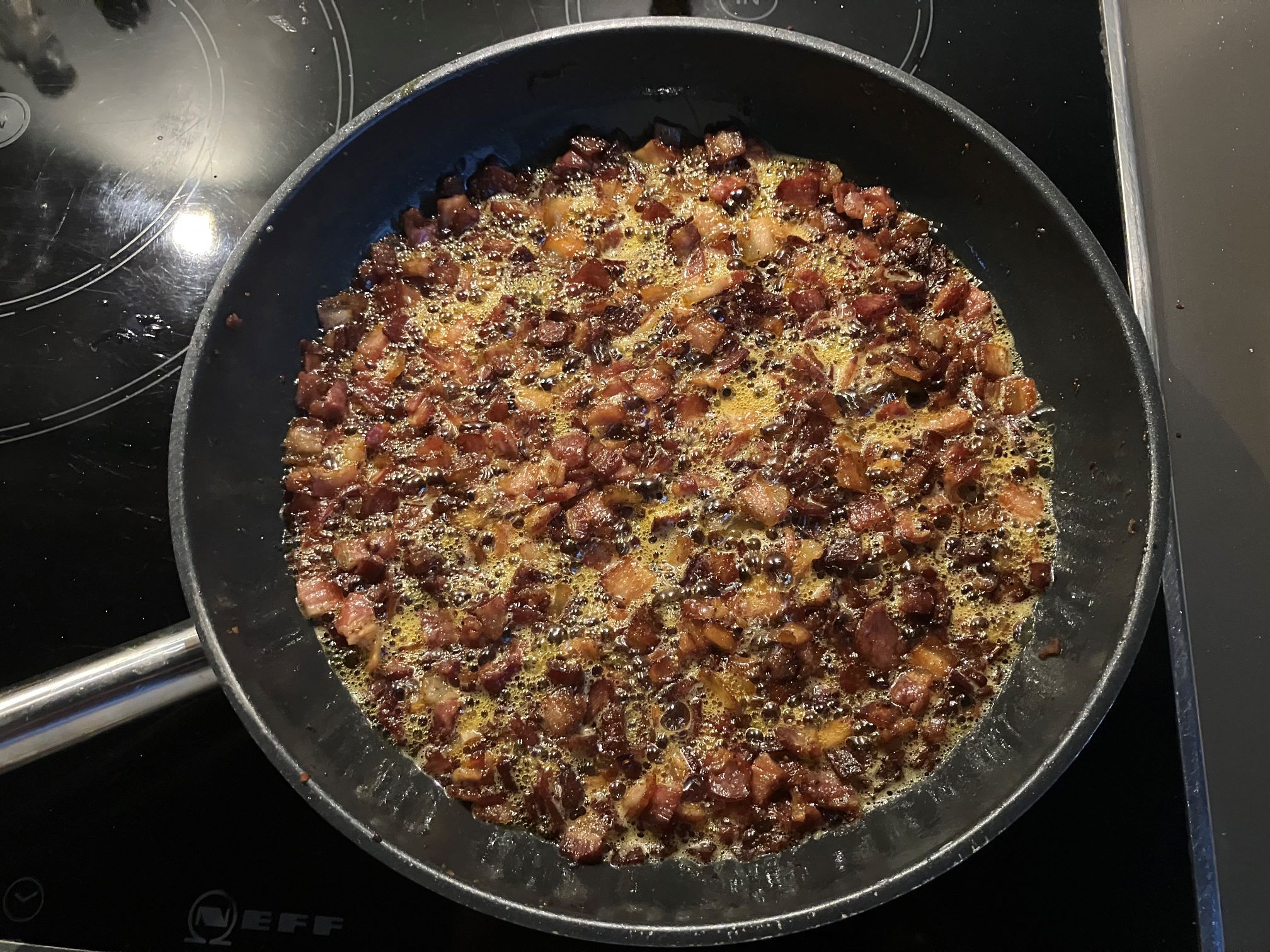 - Jetzt den Bacon zurück in die Pfanne geben, die Hitze reduzieren und das ganze ca. 10 Minuten auf die gewünschte Konsitenz einreduzieren lassen.