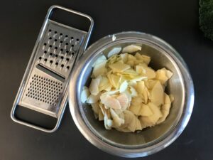 - Äpfel schälen, das Kernhaus entfernen und mit einem Gurkenhobel in dünne Scheiben hobeln. Mit Zitronensaft beträufeln.