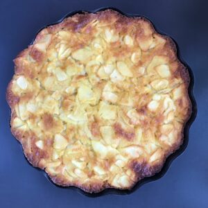 - Die Apfelscheiben unter den Teig heben. In die Form geben und glattstreichen. Form in den vorgeheizten Backofen geben und 50 Minuten backen bis der Teig goldgelb und durchgebacken ist. (40 Minuten backen + 10 Minuten mit Alufolie abgedeckt backen.)