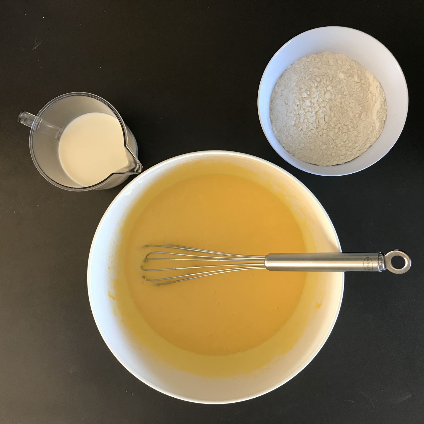 - Eier mit dem Zucker schaumig schlagen. Die weiche Butter, Mehl, Backpulver und Salz hinzugeben und alle Zutaten in einer Rührschüssel miteinander vermengen. Die Milch schluckweise dazugeben. Die Masse verrühren, bis ein glatter dickflüssiger Teig entsteht. Soviel Milch zugeben, dass der Teig zäh vom Löffel fließt. Teig an einem warmen Ort kurz ruhen lassen.
