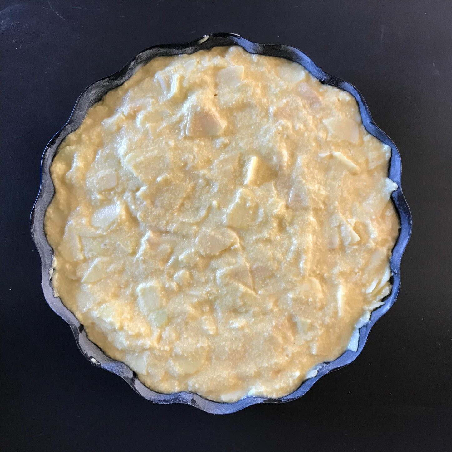 - Die Apfelscheiben unter den Teig heben. In die Form geben und glattstreichen. Form in den vorgeheizten Backofen geben und 50 Minuten backen bis der Teig goldgelb und durchgebacken ist. (40 Minuten backen + 10 Minuten mit Alufolie abgedeckt backen.)