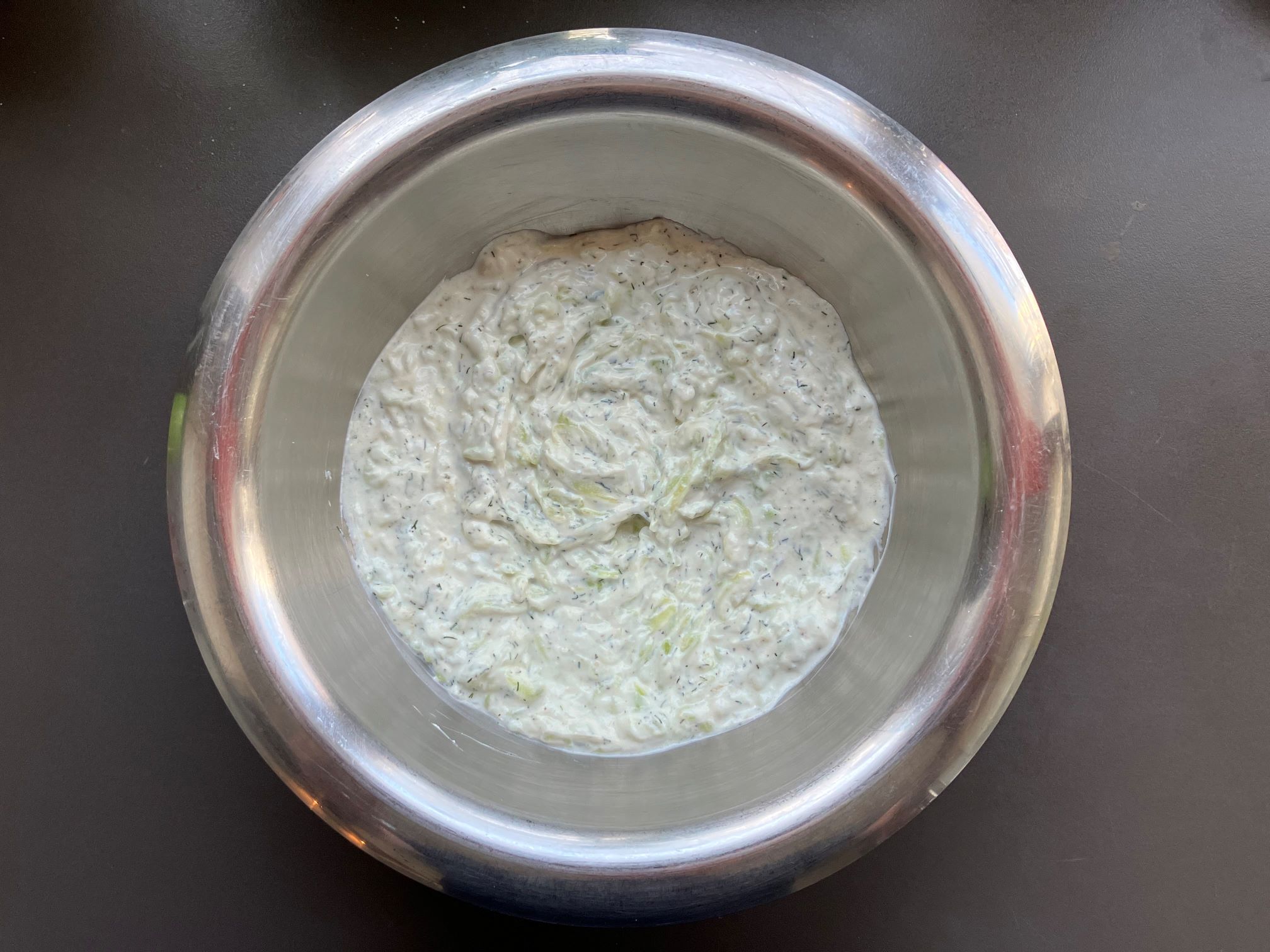 Gurke schälen und mit einer groben Reibe in eine Schüssel raspeln. Etwas salzen und 1 EL Weißweinessig dazugeben und nach 10-15 Minuten Flüssigkeit abgießen und Gurken mit einem Passiertuch auspressen.